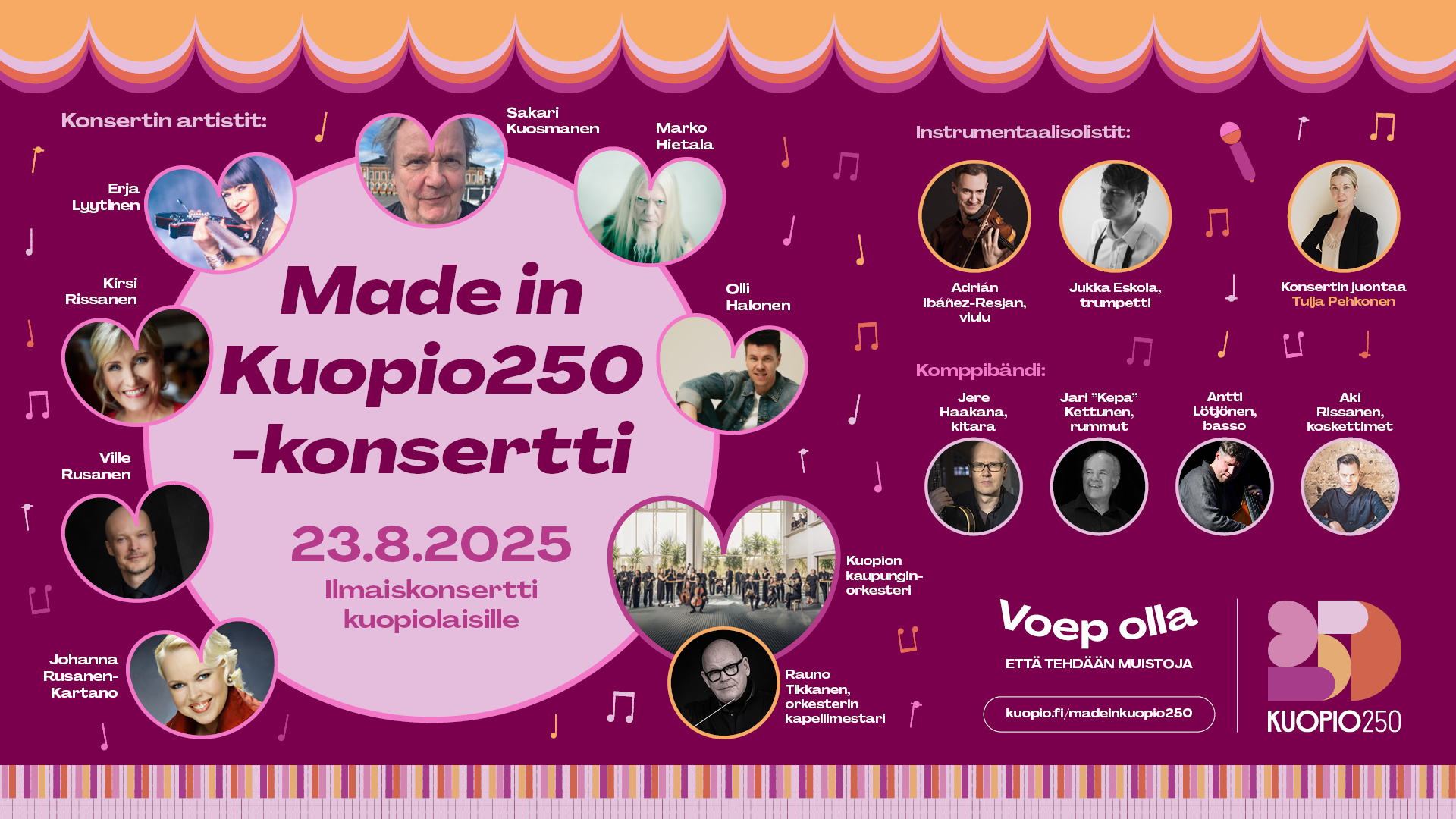 Savo-ooppera on mukana toteuttamassa 250 vuotta täyttävän Kuopion kaupungin juhlallisuuksia upealla Made in Kuopio250 -juhlakonsertilla kuopiolaislähtöisten huippusolistien ja Kuopion kaupunginorkesterin voimin Olvi Areenalla 23.8.2025 klo 18. Konsertti kuullaan myös suorana etkoineen Radio Savon Aalloilta. Jos et siis pääse paikalle niin yhdy mukaan juhlintoihin radion välityksellä!