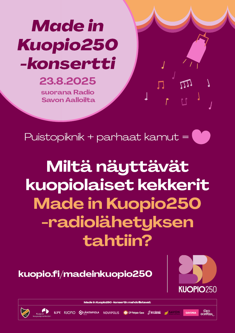 Savo-ooppera on mukana toteuttamassa 250 vuotta täyttävän Kuopion kaupungin juhlallisuuksia upealla Made in Kuopio250 -juhlakonsertilla kuopiolaislähtöisten huippusolistien ja Kuopion kaupunginorkesterin voimin Olvi Areenalla 23.8.2025 klo 18. Konsertti kuullaan myös suorana etkoineen Radio Savon Aalloilta. Jos et siis pääse paikalle niin yhdy mukaan juhlintoihin radion välityksellä!